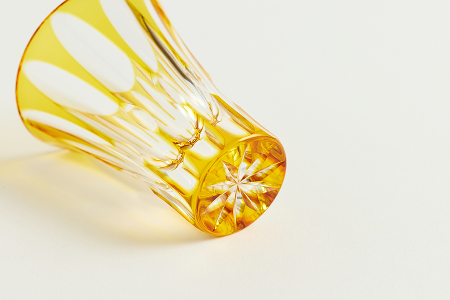 色ガラスを無色ガラスに被せた二重構造の“色被せ”のうち、透明度の高い24%レッドクリスタルで吹き上げた素地のみを使用。素地選別から粗摺り・筋彫り・面取り・磨きまで、すべての工程を職人が手作業で行います。砥石を当てる角度と回転数を精妙に操り、凹レンズ状の面を形成。丹念な手磨きで鏡面に仕上げて完成です。 ※洗浄時は食洗機の使用を避け、やわらかいスポンジを使用し優しく洗ってください。
