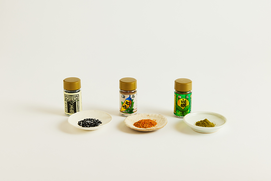 (右から)「山椒」は、蓋を開けるとそれだけでフレッシュな香りが広がります。地元・長野産をはじめ、希少な国産山椒を選りすぐって使用。爽やかな香りと心地よいしびれ、スッと残るあと味が印象的です。温かい麺類などはもちろん、唐揚げに振りかけるのもおすすめ。オリジナル「七味唐辛子」は、上高地帝国ホテルの料理長が八幡屋礒五郎スタッフと吟味を重ねて作り出した香りと辛みが調和する1本。ほんのり香る柚子の風味がポイントになっています。「ごま塩」は、長野県飯綱町をはじめ、地元長野の自社畑で栽培したごまと国産の塩をブレンド。ご飯に振りかけたり、焼き魚や炒め物に使ったり、風味豊かなごまの香ばしさと食感を存分にお楽しみください。