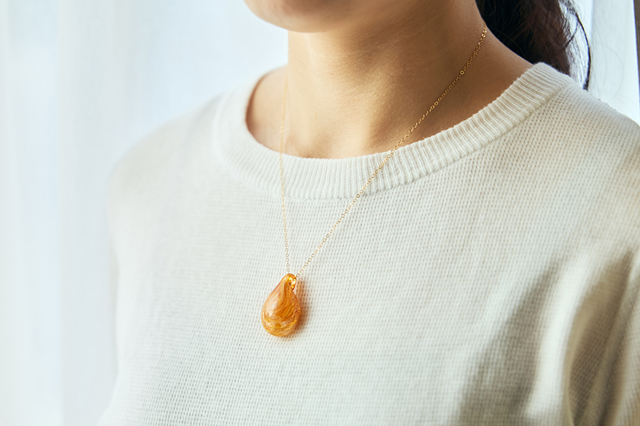 明るく温かみのあるカラーは、着ける人に華やぎと若々しい印象を与えてくれます。肌なじみも良い色合いなので、普段、大ぶりなアクセサリーを着けない方でも取り入れやすいはず。ピアスのみ、またはネックレスのみの一点使いでも十分に印象的なので、食事会や観劇など、ドレスアップを楽しみたい日にもぴったりです。