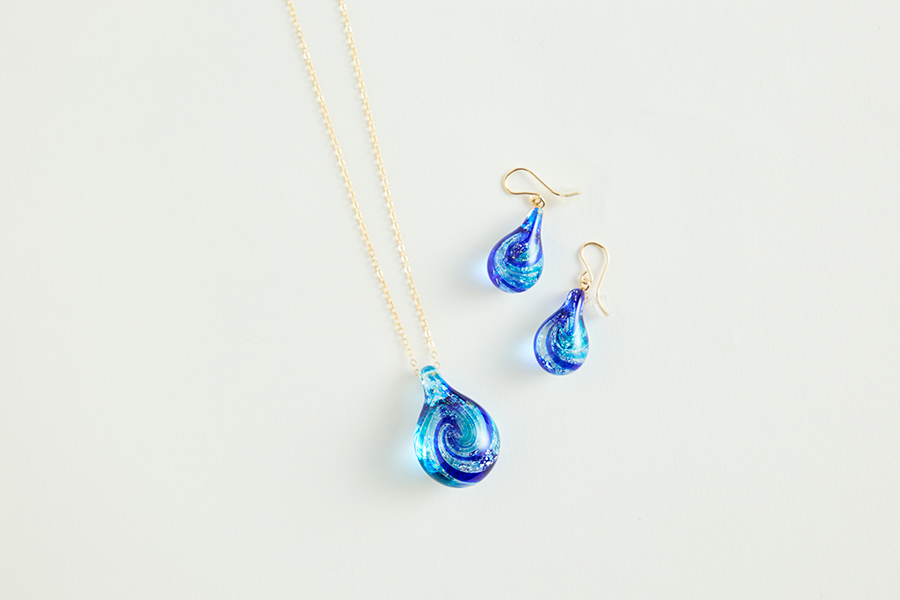 「Otaru Ocean - 潮」と名付けられた澄んだブルーが美しいピアスとネックレスは、その名の通り小樽の海をイメージしてデザイン。“一粒”の中に濃淡のある青色が重なっており、見る角度によってさまざまに印象が変化。耳元や胸元でふと光を受けるたびに、キラリと涼やかな輝きを放ちます。
